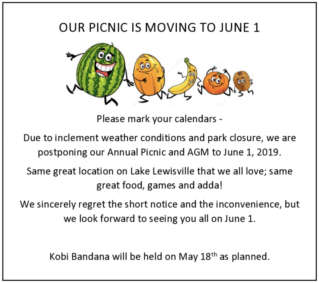 BADFW Annual Picnic Postponed to June 1st, 2019